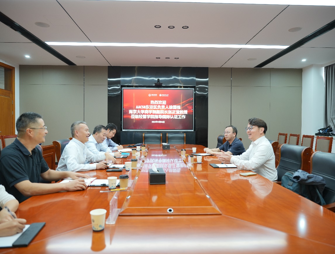 On the afternoon of September 26, Mr. Xu Guodong, Director of AACSB East Asia, and Professor Zhang Zhengtang, Vice Dean of Nanjing University School of Management, visited the School of Economics and Management to provide guidance and engage in discussions regarding the AACSB accreditation process. Attendees included Li Xinchun, Party Secretary of the School, Dean Ding Zhihua, and members of the International Accreditation Office.