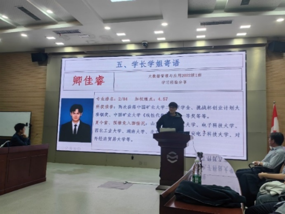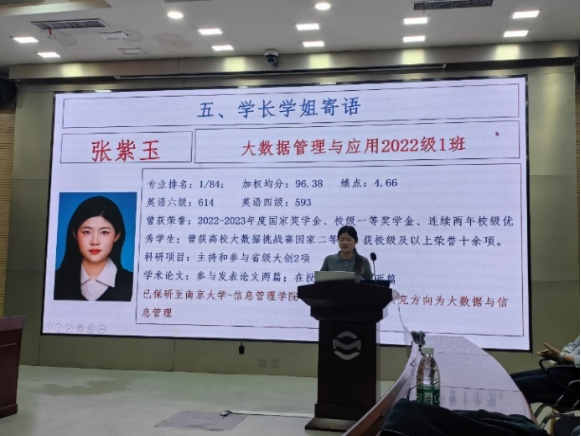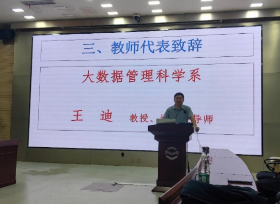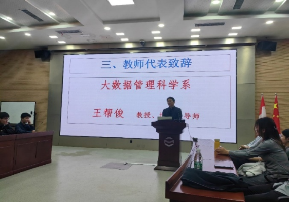 Professors Wang Bangjun and Wang Di, speaking as faculty representatives, noted that the era of intelligent data brings both opportunities and challenges. They emphasized that the Big Data Management and Application program, which tightly integrates computer science and management science, requires strong interdisciplinary competence. They encouraged students to build firm foundations in management theory—mastering subjects such as management science, operations research, statistics, and systems science—and to acquire digital and computational thinking skills. They also highlighted the importance of learning data mining, modeling, artificial intelligence, and system architecture to fully develop big data analytical capabilities. Furthermore, they stressed the significance of research experience, advising students to actively participate in faculty research, competitions, and training projects to cultivate analytical and problem-solving abilities.