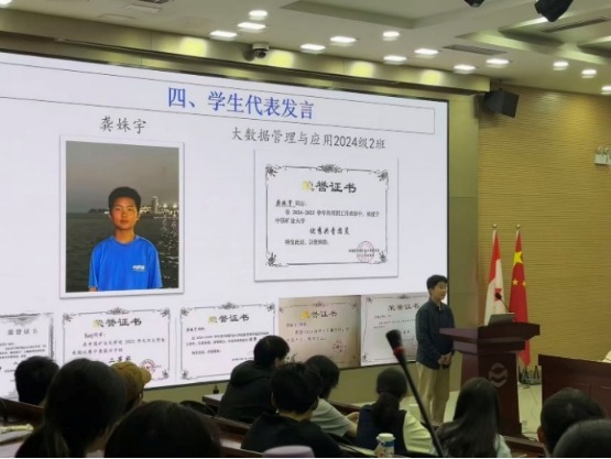 Student representatives Gong Shuyu (Class 2) and Yin Luyao (Class 1) shared their experiences. Gong expressed deep gratitude for the faculty’s rigorous academic attitude and patient guidance, urging peers to build solid foundations in management, economics, and computer science while maintaining curiosity for emerging technologies like AI and data mining. Yin described her journey of transferring into the program and her growing fascination with solving real-world problems through data. She encouraged fellow students to stay goal-oriented, overcome challenges with confidence, and focus on using data to create value for businesses and society.