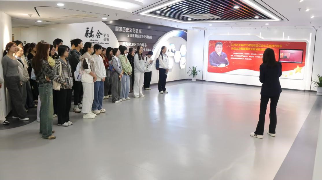 During the park tour, the group visited the Intelligent Manufacturing Training Base, the Administrative Service Center, and the Huaihai Gig Market. Director Liu guided students to reflect on the inner connection between technological innovation and the Party’s original mission, turning each smart-technology application scenario into a vivid classroom for understanding how Party leadership drives high-quality industrial development.