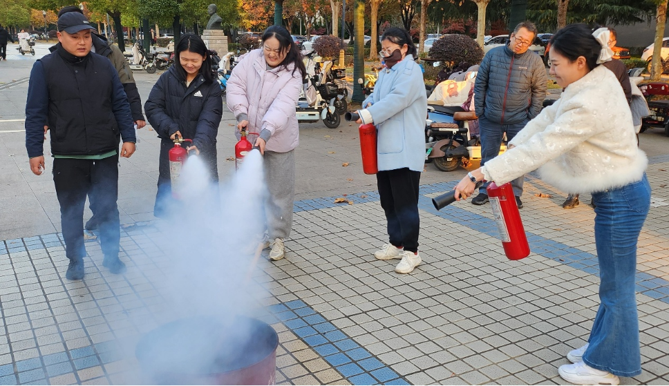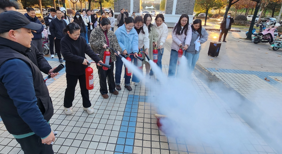 During the practical training session, professional staff from the university’s Security Office demonstrated the correct use of fire extinguishers, explaining the key operational steps: “lift, pull, aim, and press.” Under their guidance, faculty members and students actively participated in hands-on practice, using fire extinguishers to put out simulated initial fires. The combination of theoretical instruction and practical experience helped participants overcome fear of fire emergencies and gain confidence in using firefighting equipment.