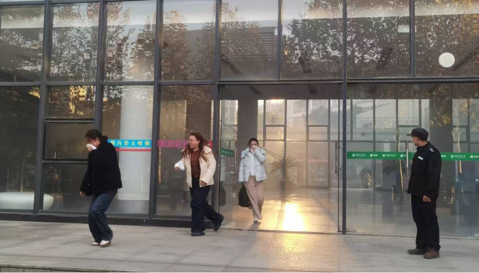 At exactly 4:00 p.m., the drill officially began with the sudden sound of a simulated fire alarm. Artificial smoke was released simultaneously on the first through fifth floors of the building, quickly filling the corridors and creating a realistic emergency scenario. After hearing the alarm, faculty members, administrative staff, and students responded immediately, following the emergency evacuation plan. Using wet towels or clothing to cover their noses and mouths, participants lowered their posture and moved quickly and orderly along the designated evacuation routes to exit the building.